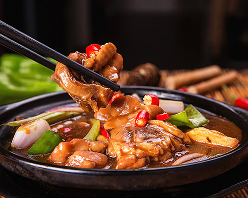 黄焖鸡米饭又叫香鸡煲,浓汁鸡煲饭,是鲁菜名吃。是源自山东省济南市的汉族菜系,属于鲁菜。鸡肉选材鲜嫩三黄鸡鸡腿肉,做出的黄焖鸡嫩滑多汁,汁味和香味浸入鸡肉内部,色泽均匀。用土制砂锅烧制,砂锅内沸腾,香气直入鼻中,鸡块滚烫,色度与亮度呈现比较好状态。