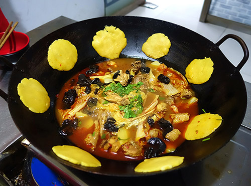 地锅鸡是一道传统名菜,起源于苏北和鲁南交界处的微山湖地区(徐州地区)。主要食材有鸡肉、鸡蛋、白面粉和玉米粉,口味鲜醇,饼借菜味,菜借饼香。