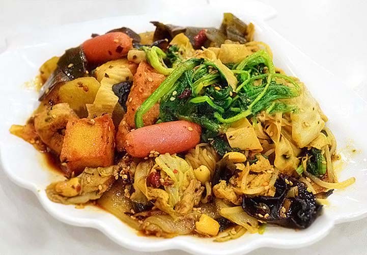 麻辣拌主要有土豆片、海带结、豆皮、丸子、鱼丸、甘蓝、宽粉、油菜、白菜、闷子、豆泡、蟹棒、蘑菇、素丸子(又称红丸子)等原料组成。和麻辣烫原料相似,不过是在煮过后沥干水分,加盐,陈醋,糖,花生碎,辣椒,孜然,麻油等拌匀后食用,在引入麻辣烫的基础上发明的,非常受欢迎,有甜酸口味、麻辣口味、咸辣口味、甜辣口味,而且口味可以根据个人喜好来进行调配,出现在各个中小培训门口,受学生们的欢迎,现在已经成为街头小巷的美味小吃。