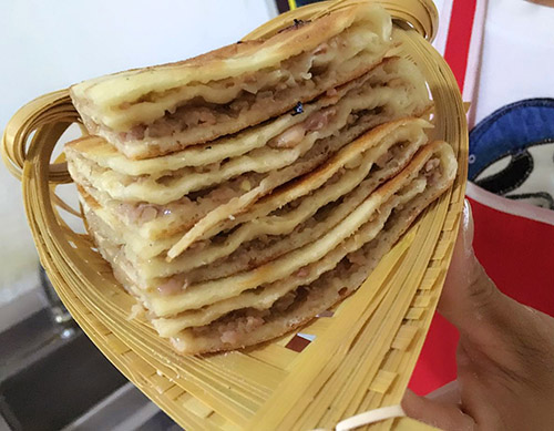 是一道汉族面食小吃。由十几种香辛料的调料配方,其面晶莹透亮,肉馅色泽鲜嫩。它以色泽金黄、层次鲜明、外酥里嫩、香酥适口、油而不腻,香飘四溢。更重要的是它制作工艺非常具有观赏性,真是面皮薄如纸,特别是肉饼要出炉的时候,令人垂涎的香气四溢,真是好闻好看又好吃。
