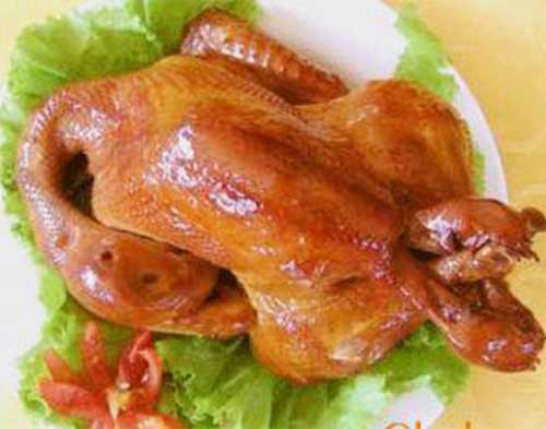 烧鸡浅红带微黄色,皮肉完整无损,咸中带甜,香嫩鲜美,鸡骨一触即脱。鸡身呈浅红色,鸡皮不破不裂,鸡肉完整,鸡味鲜美,肥而不腻。